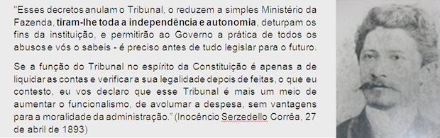 A data escolhida, 27 de abril, remete ao ano 1893, momento memorável em que o então Ministro da Fazenda do Governo de Floriano Peixoto, Serzedello Corrêa, deu exemplo de espírito público na defesa da autonomia e independência do Tribunal de Contas da União. A carta de demissão foi assinada nos seguintes termos: