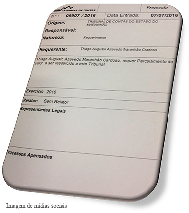 Nesta quinta-feira (7/6), Thiago Maranhão entrou com pedido de parcelamento no TCE-MA do valor que deve ressarcir ao órgão, conforme imagem do documento que circula nas mídias sociais.