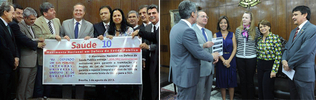 BRASÍLIA. O presidente do Senado, Renan Calheiros (PMDB-AL), recebeu, no início da tarde desta terça-feira (13), o Movimento SAÚDE +10 que reuniu cerca de um milhão e novecentas mil assinaturas em defesa do projeto de lei de iniciativa popular para alterar a Lei Complementar nº 141, de 2012, e aumentar o aporte de recursos da União em ações de saúde.